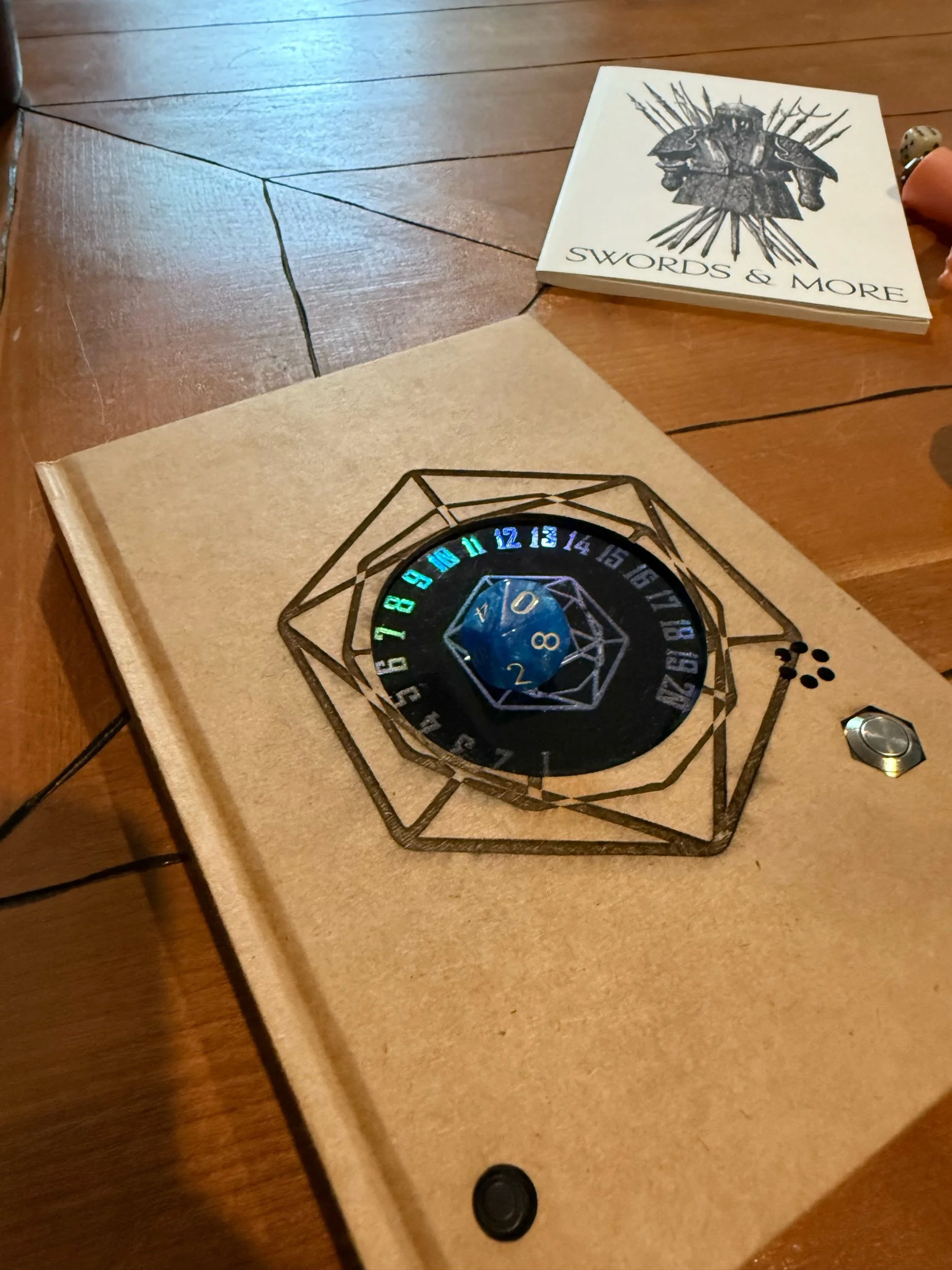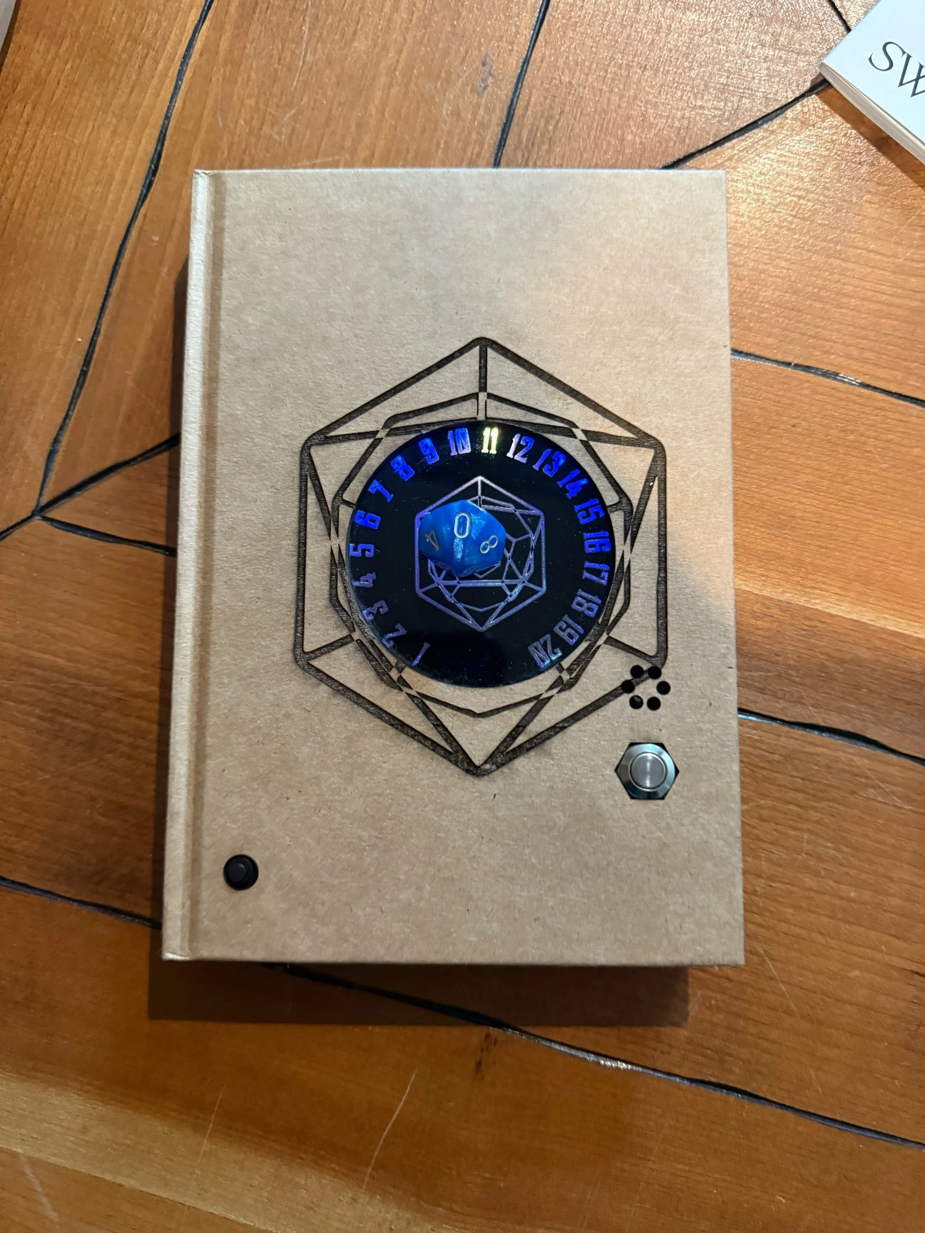 Inside the cover is a digital D20 engine that watches for motion and responds with glowing LEDs. When the lights are flashing, the tome is “charged.” Place it on the table and it casts your roll, lighting up your result like a tiny boss battle screen.